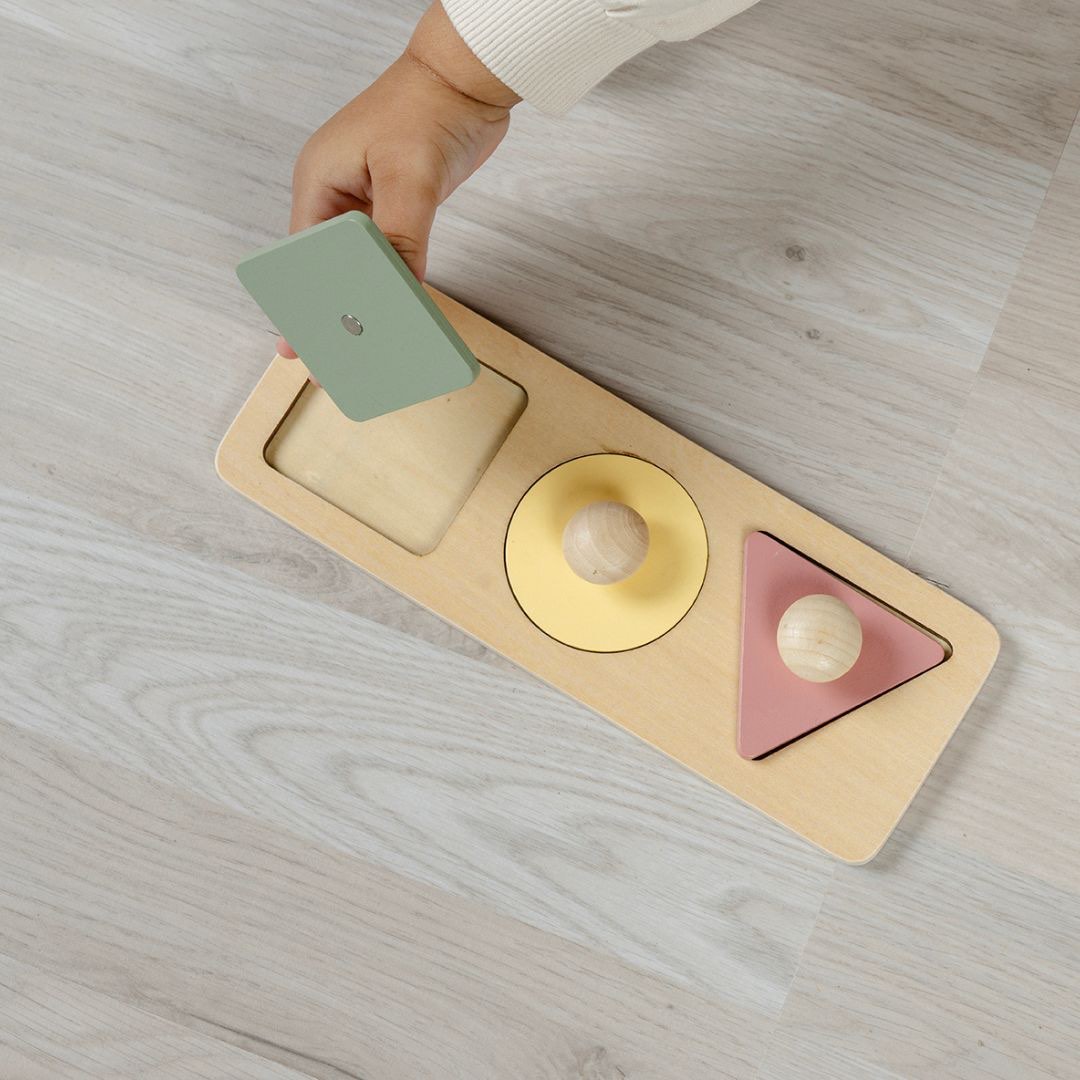 Οι κύβοι είναι γεωμετρικοί και τοποθετούνται έτσι ώστε το παιδί να δημιουργήσει έναν πύργο.