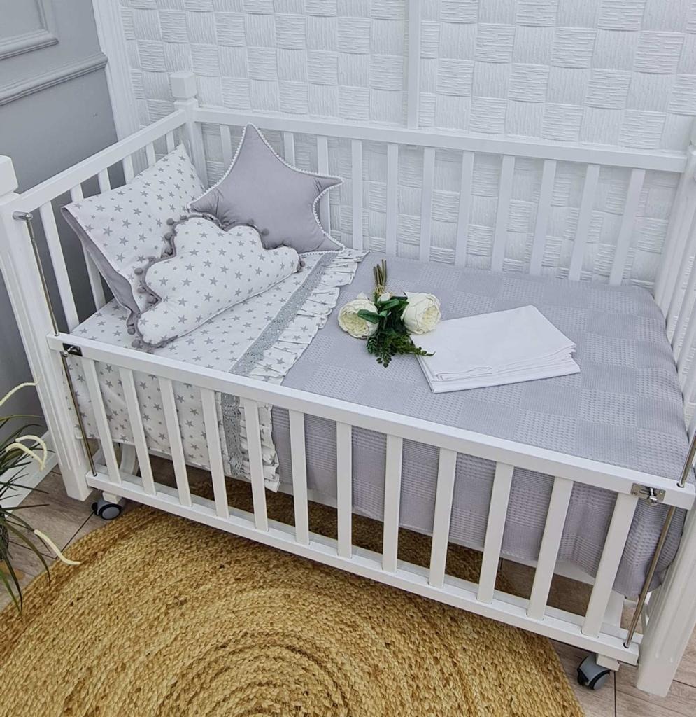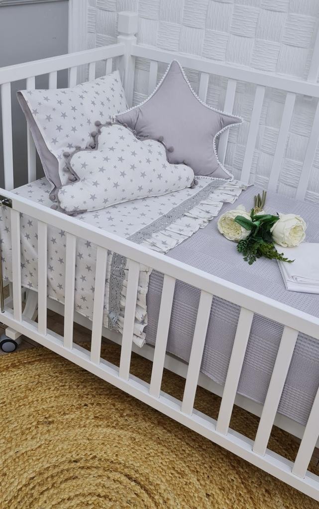 Χειροποίητο πλήρες σετ κούνιας από 100% οργανικό βαμβάκι ραμμένο με αγάπη και μεράκι για την προίκα του μωρού σας .