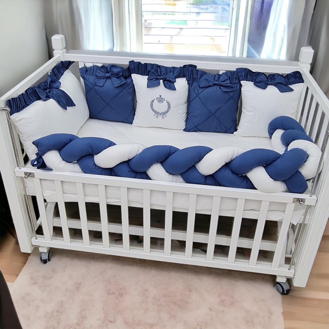 Η πλεξούδα είναι δίχρωμη με μήκος 150cm , τα 4 προστατευτικά μαξιλάρια είναι το καθένα σε διαστάσεις 33cm x 33cm και το μαξιλάρι στο προσκέφαλο 63cm x 33cm.