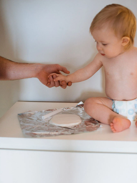 Πιέστε το χέρι ή το πόδι του μωρού σας στον πηλό απαλά αλλά αρκετά σκληρά για να δημιουργήσετε ένα σχήμα. Αν κάνετε λάθος, κανένα πρόβλημα! Μπορείτε να το ξαναφτιάχνετε όσες φορές χρειάζεται μέχρι να έχετε το τέλειο αποτέλεσμα. Μόλις έχετε το αποτύπωμά, χρησιμοποιήστε το εργαλείο διαμόρφωσης για να κάνετε έναν κύκλο και μια τρύπα για την κορδέλα. Στη συνέχεια, τραβήξτε τον πηλό που περισσεύει και αφήστε το να στεγνώσει για 1-2 ημέρες.